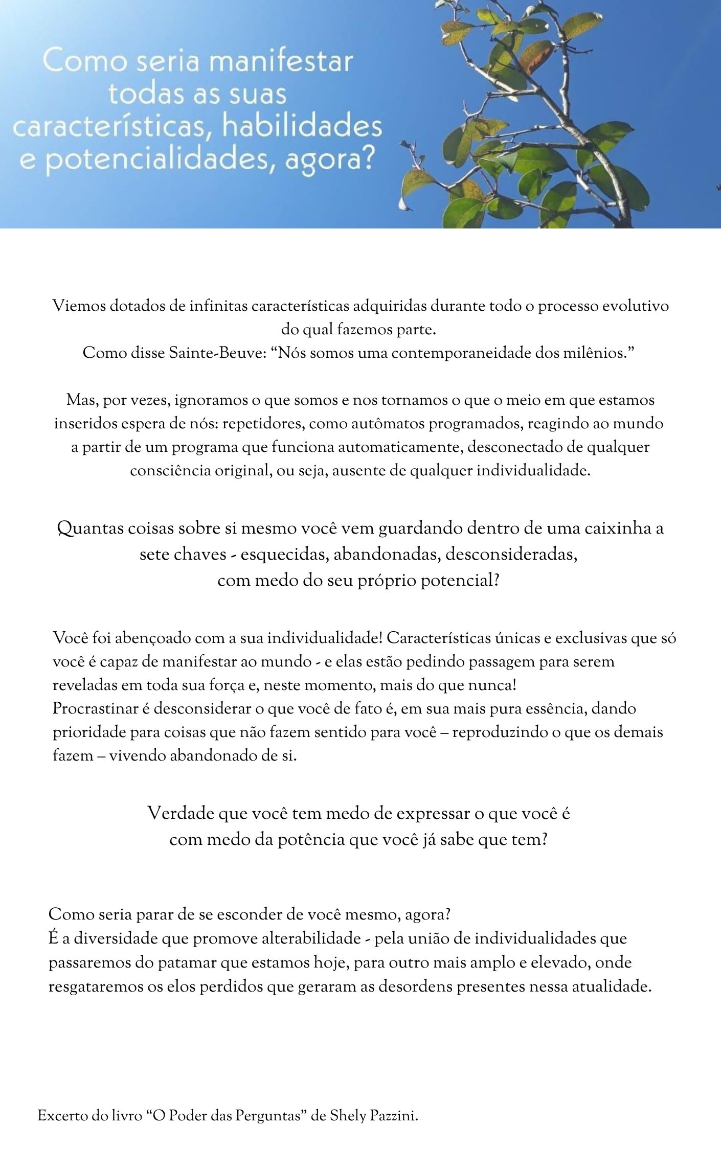 “Como seria manifestar todas suas características, habilidades e potencialidades, agora?” – essa é uma pergunta-chave do livro “O Poder das Perguntas”, da autora Shely Pazzini.